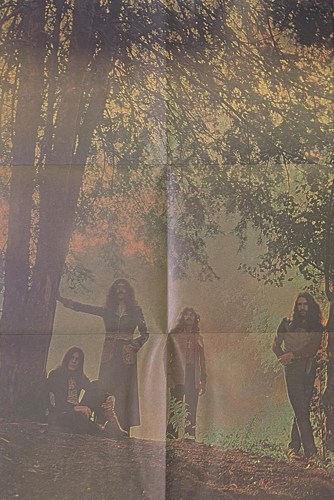 Keith McMillan returned to do the cover. He came up with a stark simple design of bold lettering on a black background. The production of the sleeve was handled by The Bloomsbury Group, and to make it stand out they embossed the lettering for the UK release. It also had a flap style closure to the sleeve. On the back were Geezer’s lyrics, featured for their thought provoking content and also to help them (hopefully) from being misconstrued. Inside, along with the record, was a poster of a group photograph taken by McMillan in Black Park. The soft muted tones of the image capture the mood of the record perfectly.