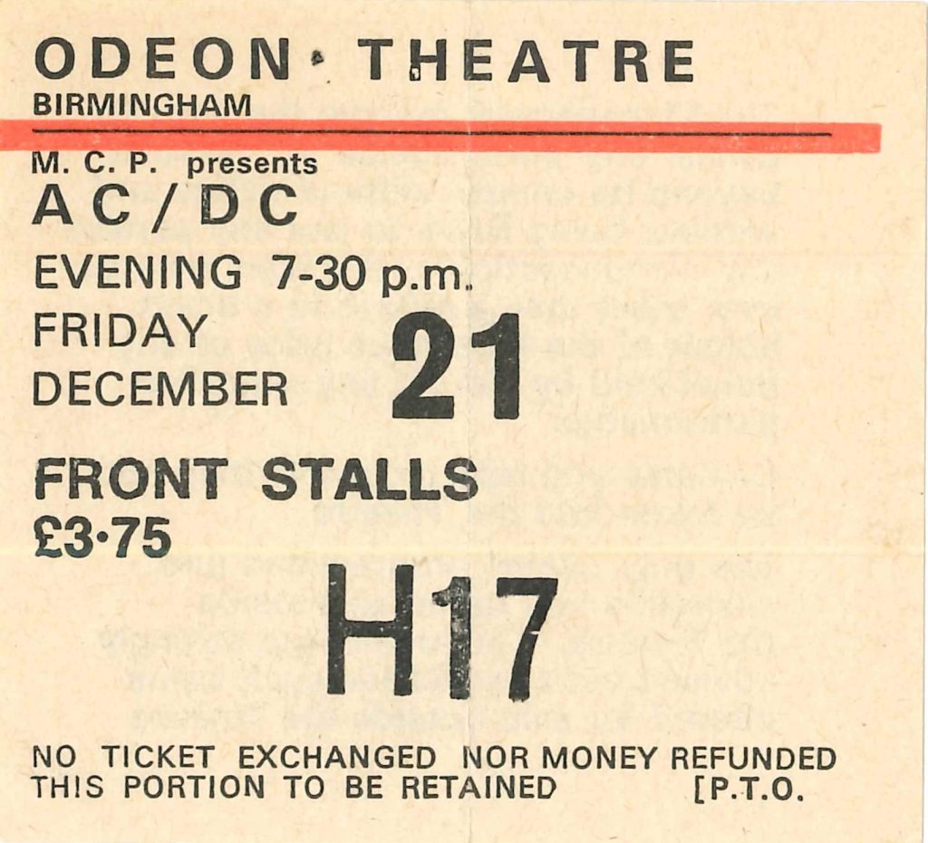 I got right to the front for AC/DC. This was a ‘thing’ then at the Odeon Although it was ticketed by area and although they had security checking tickets to access the front stalls there was still two ways in which they could do little about. The clever way was that a person would leave the front stalls with his ticket and at least one spare from a friend. This spare ticket he or she would then pass to someone who wasn’t in the front stalls but would use the spare to get access. Because there would be a crowd already leaning on the stage it was impossible to tell who was supposed to be there and who wasn’t. In later years they attempted to get everyone to sit down till the last minute so they could monitor the numbers in the front stalls. The other access method was more physical, very fast and fun. Quite simply, when the lights went down for the headliners there would be a ‘rush to the front’ from the rear stalls, picking up numbers of fans running as it went. This was like two stampedes heading right at lone security men who wisely would just move out of the way.