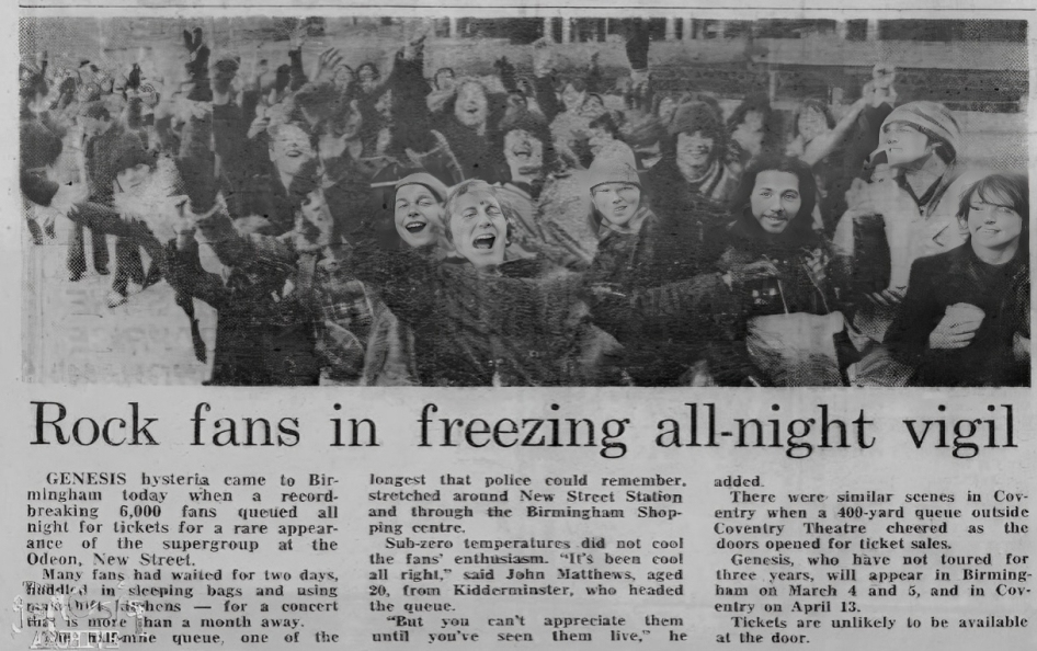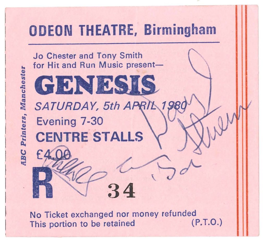 It started when the tickets went on sale. To get one or two tickets (and I seem to remember it was limited to two) you had to queue outside the Birmingham Odeon. There was no online or postal applications. Fans actually started queuing the night before but this was too hardcore for me. Instead I turned up at the Odeon on the day they went on sale and was unable to get a ticket. Disconsolate but philosophical I went into the Odeon to see what else might have been added to the gigs list. While I was looking at the boards the manager of the Odeon, Chris Mott, called me over and asked me if I wanted a Centre Stalls ticket for Genesis. I was stunned, he did it because I knew all the staff and was one of the most regular attendees. This was a lovely gesture and off I went with a £4 ticket!